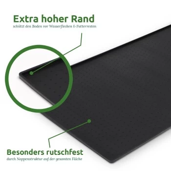 Die Futterunterlage besteht aus biegsamem, langlebigen und 100 % lebensmittelechtem Silikon. Die OberflÀche ist besonders rutschfest durch die dort befindliche Noppenstruktur und besitzt durch den extra hohen Rand einen Auslaufschutz. So gehören Wasserflecken und Futterreste der Vergangenheit an. Zudem ist sie wasserdicht und entsprechend sehr leicht zu reinigen.