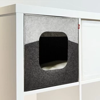 Die runde Höhlenöffnung besitzt einen Durchmesser von ca. 17,5 cm und bietet einen einfachen Einstieg in die Katzenhöhle. Sie ist groß genug um auch bei weiteren Sprüngen in ein höher gelegenes Fach im Regal einen einfachen Eingang zu bieten. Der Filzwürfel ist vom Design schlicht und in zeitlosem Hellgrau-Dunkelgrau gehalten.