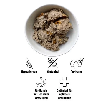 Unser WALD Nassfutter ist die erste Wahl für sensible Feinschmecker und nachhaltige Genießer und als hochverdauliches Alleinfuttermittel für ausgewachsene Hunde aller Rassen und Größen geeignet.