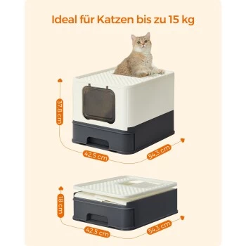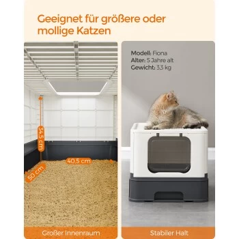 - – Für größere oder dicke Katzen: Diese Katzentoilette mit Top-Entry ist innen geräumig und die Oberseite trägt bis zu 15 kg.