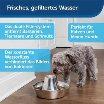 Halten Sie Ihr Haustier mit dem PetSafe® Trinkbrunnen Streamside gut hydriert, gesund und zufrieden. Der Trinkbrunnen stellt sicher, dass Ihrem Haustier jederzeit frisches, gefiltertes Wasser zur Verfügung steht. Katzen und Hunde finden fließendes Wasser in der Regel interessant. Es regt sie an, vermehrt zu trinken, was allgemein für ihre Gesundheit förderlich ist. Mit einer Wasserkapazität von 1,8 Liter eignet sich dieser Trinkbrunnen optimal für Katzen oder kleine Hunde. Der Turm sorgt für einen angenehm leise sprudelnden Wasserlauf, der auch scheue oder schüchterne Haustiere zum Trinken anlockt. Der mit einer Pumpe betriebene Trinkbrunnen ist mit einem Aktivkohlefilter und einem Schaumfilter ausgestattet. Diese halten das zirkulierende Wasser frei von Tierhaaren, Speichel und unangenehmen Geschmäckern.