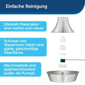 Das hochwertige Material des Trinkbrunnens ist BPA-frei, hygienisch, kratzfest und rostbeständig. Turm und Schale können zum Reinigen einfach in den oberen Korb des Geschirrspülers gestellt werden. Die elektrische Pumpe wird von Hand gereinigt.