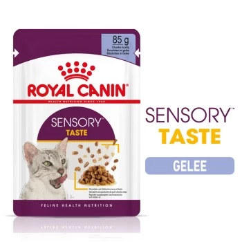 Für eine vielfältige Fütterungserfahrung der Katze ist ROYAL CANIN SENSORY™ TASTE Feuchtnahrung als Stückchen in Soße oder in Gelee erhältlich. Ergänzt wird die neue Feuchtnahrung durch zwei weitere Sorten: SENSORY™ SMELL und SENSORY™ FEEL in jeweils zwei Texturen und durch einen Multipack mit den Sorten SENSORY™ TASTE, SMELL und FEEL in Soße.